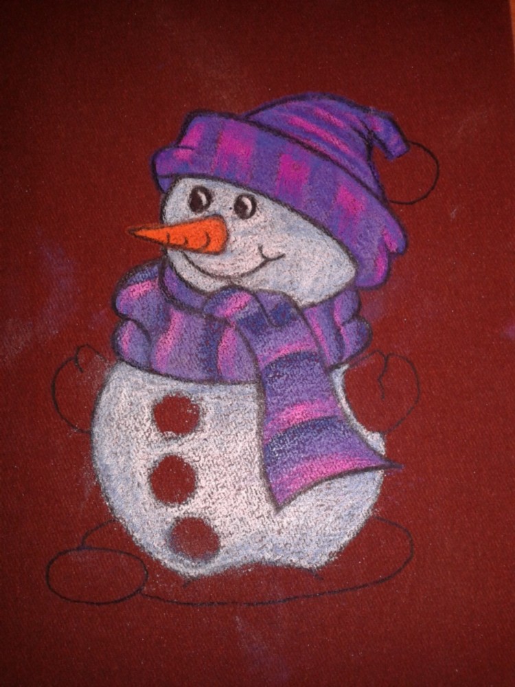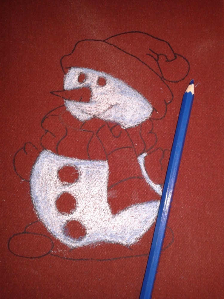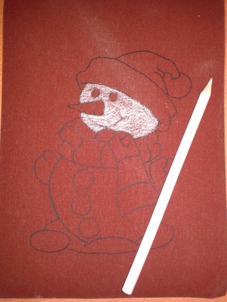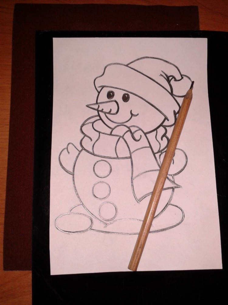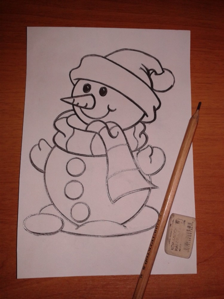 На листе белой бумаги (170*240) простым карандашом нарисовать снеговика. Можно использовать готовую картинку