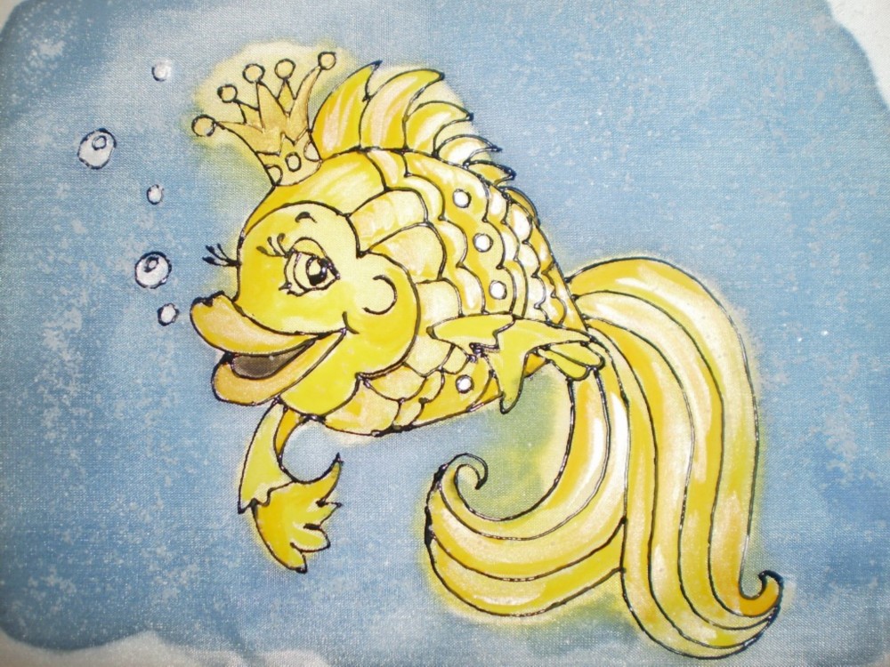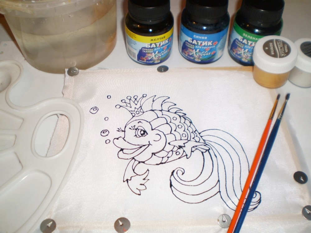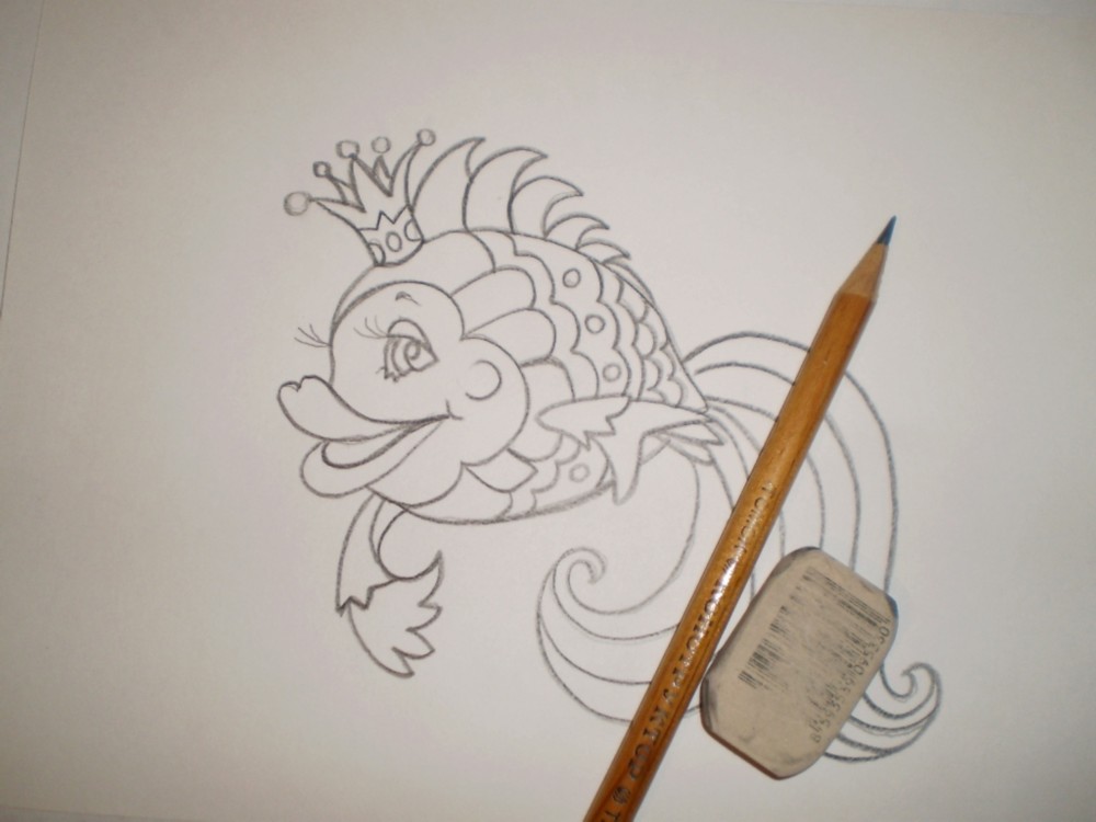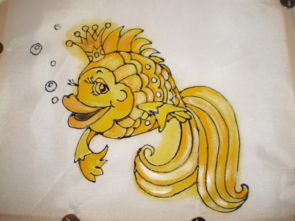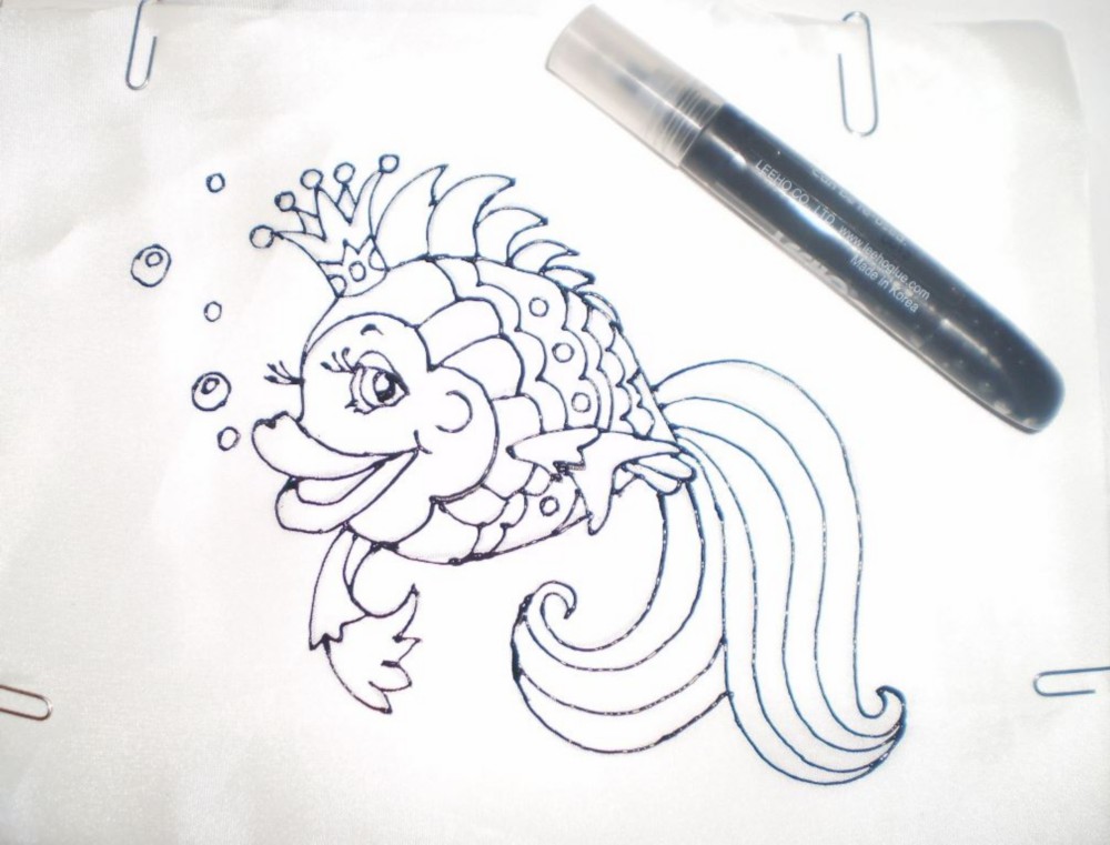 I этап - Роспись ткани. Первоначально создаем эскиз рисунка золотой рыбки простым карандашом.