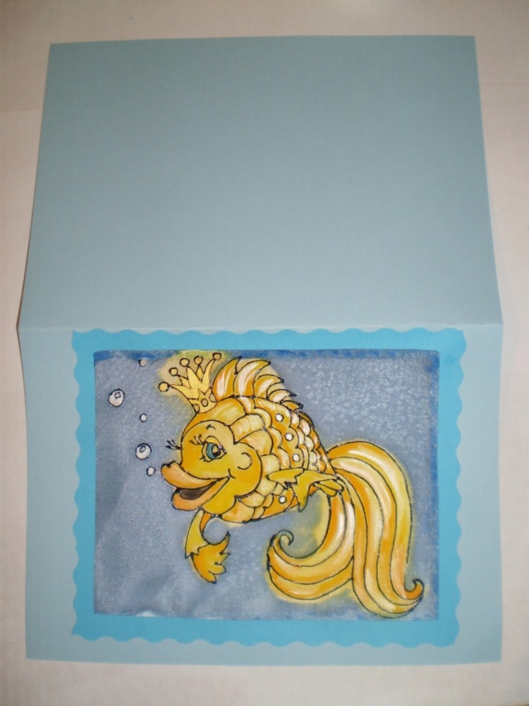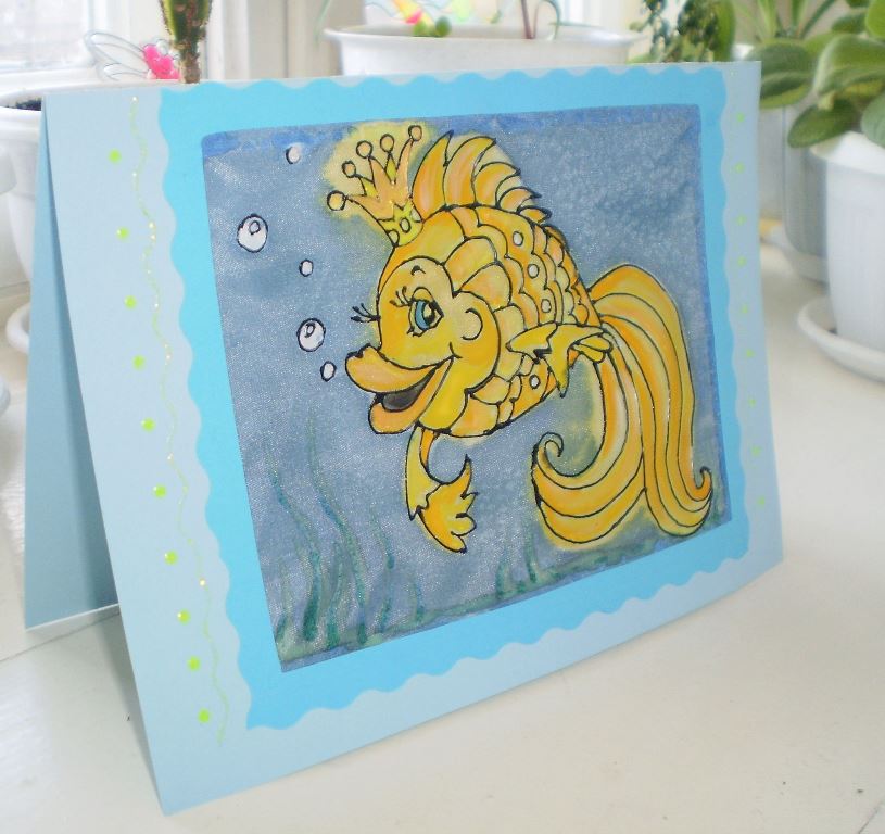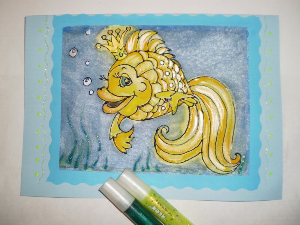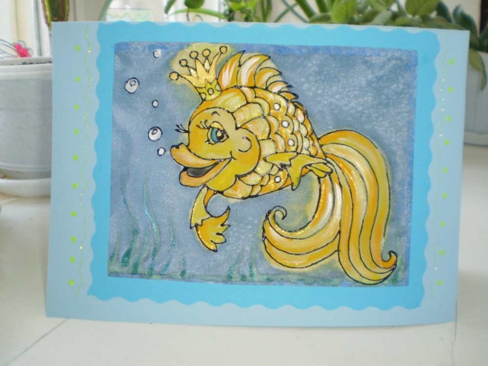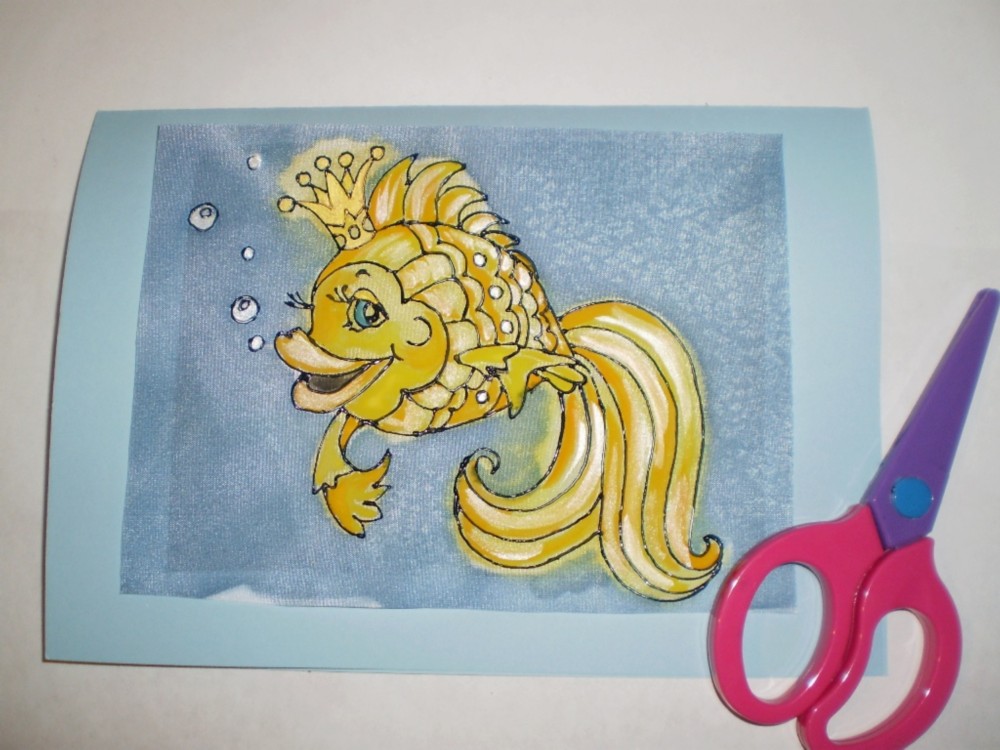 I этап - Роспись ткани. Первоначально создаем эскиз рисунка золотой рыбки простым карандашом.