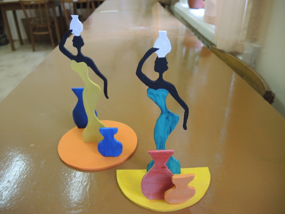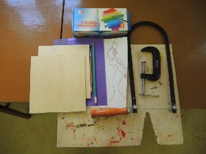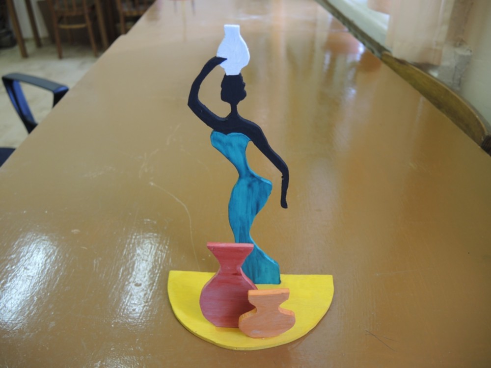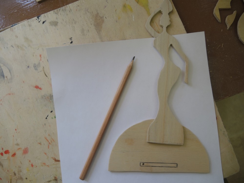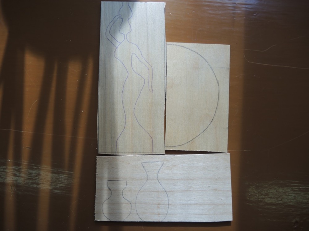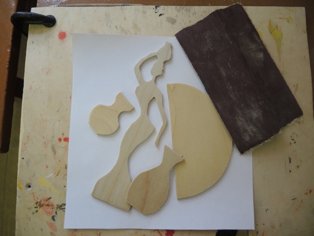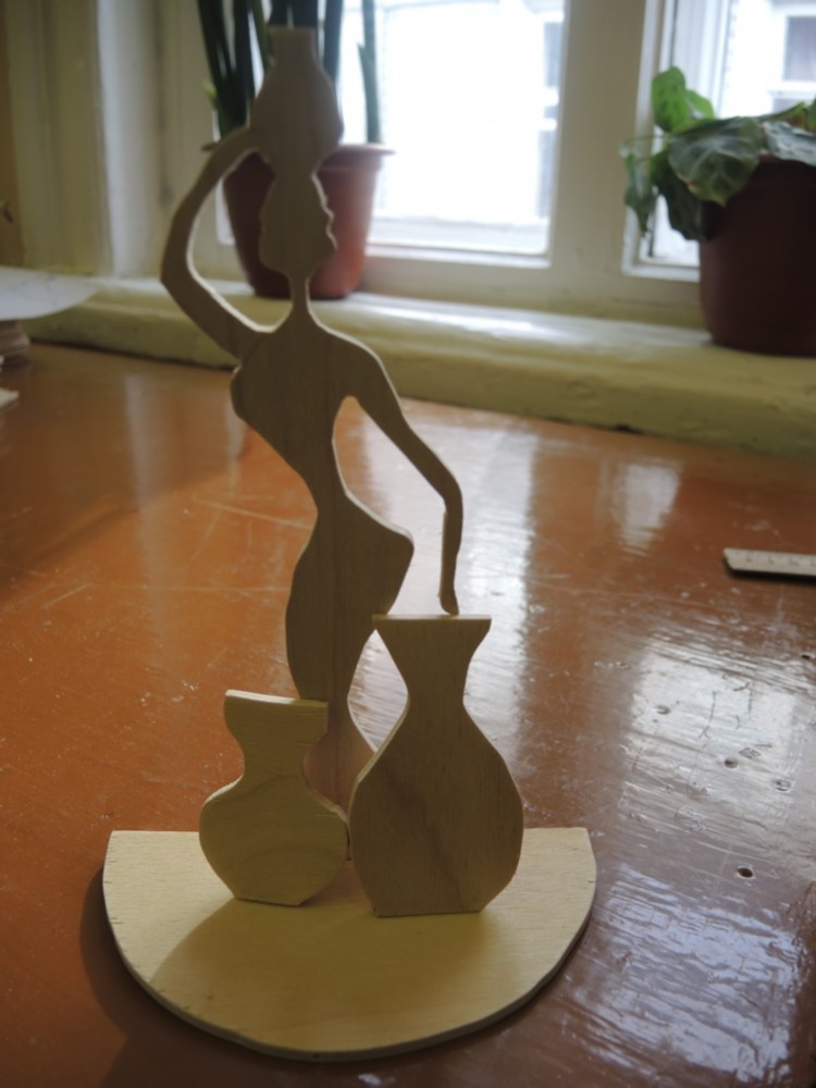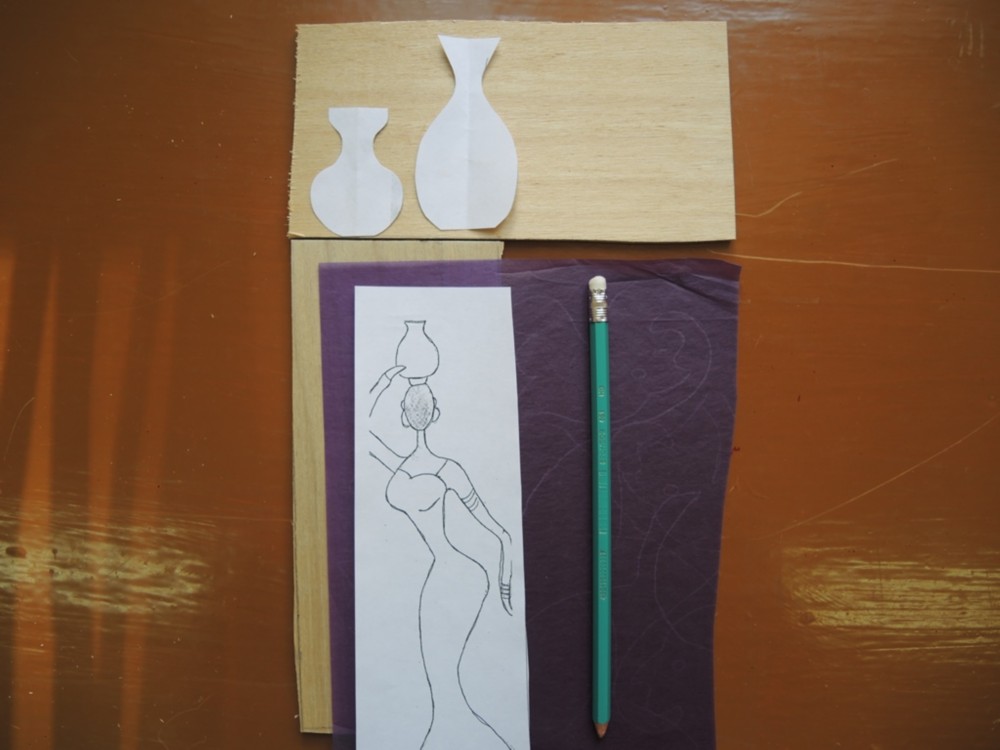На фанеру при помощи копировальной бумаги перевести силуэт африканки, кувшины (большой и маленький) и основу в форме полукруга
