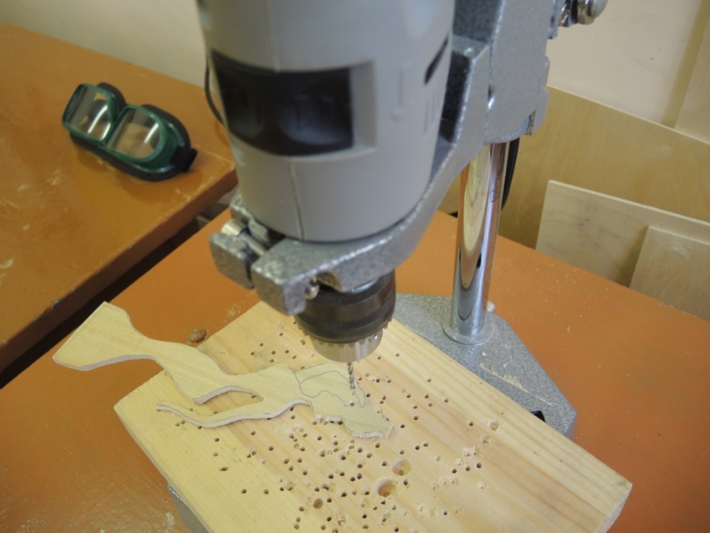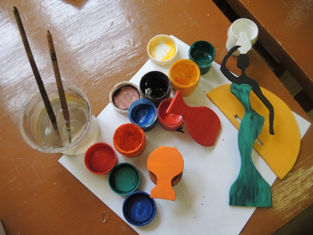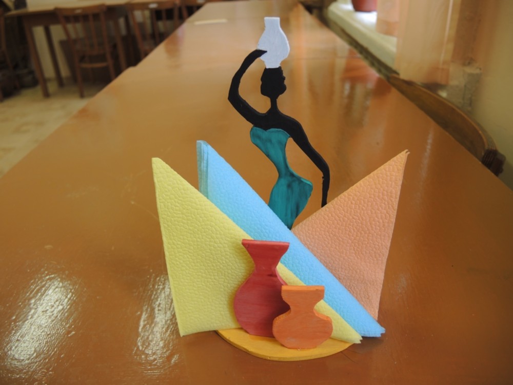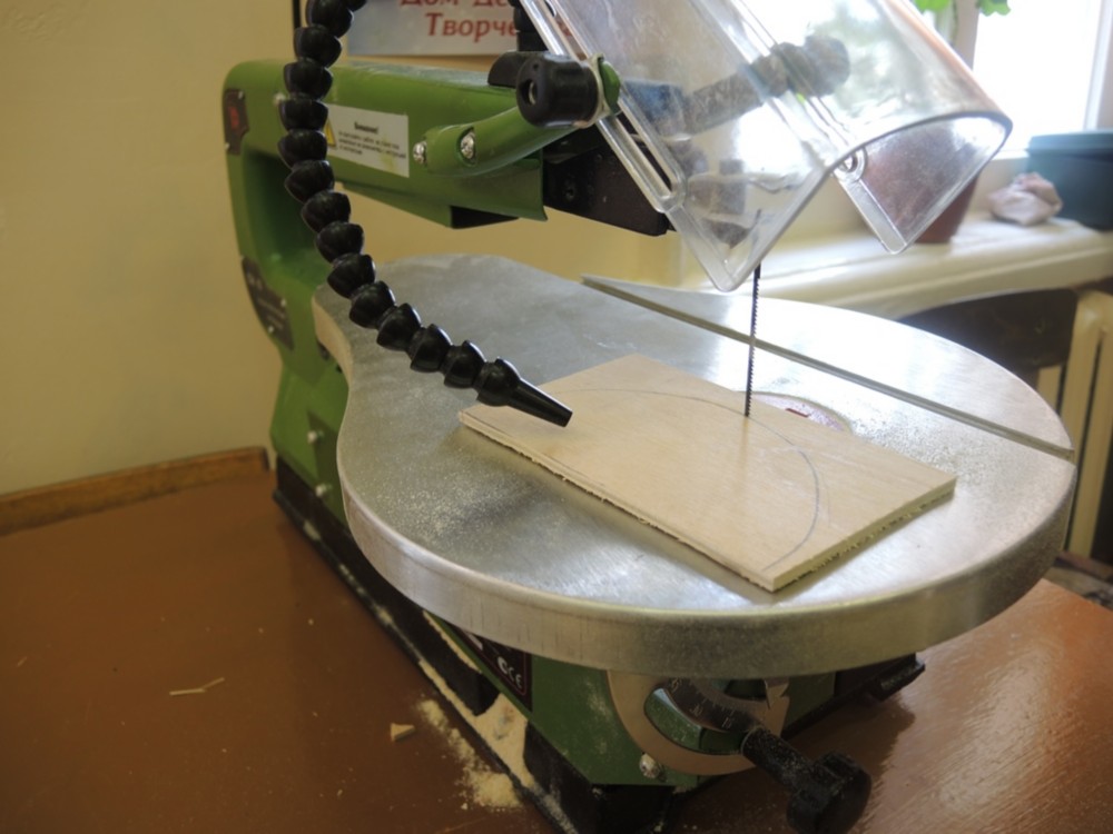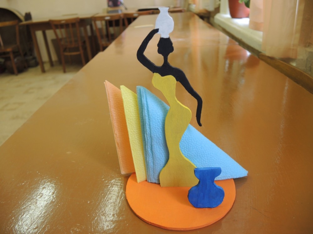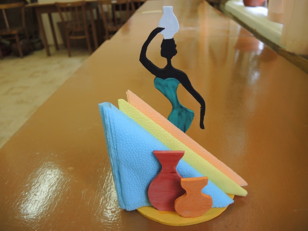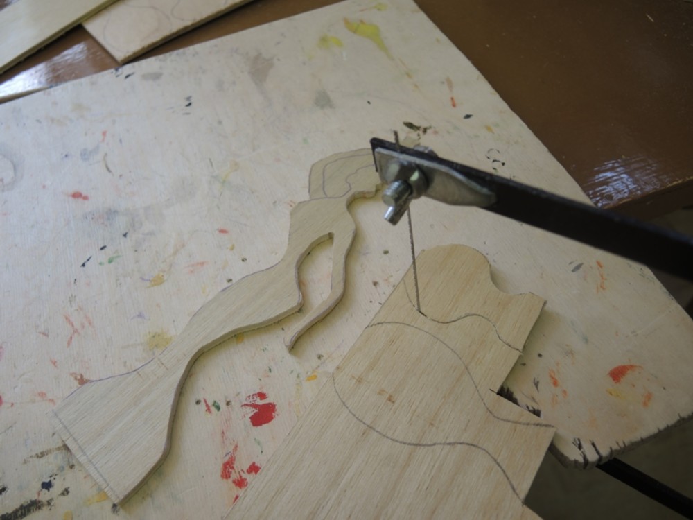 На фанеру при помощи копировальной бумаги перевести силуэт африканки, кувшины (большой и маленький) и основу в форме полукруга