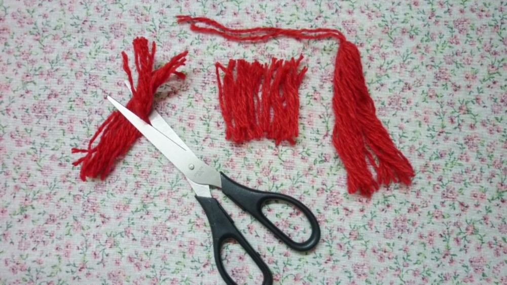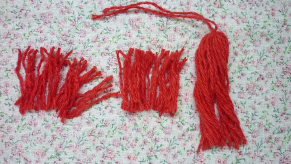 Нарезать 50 см нитки на отрезки по 4 см. Перевязать по середине. С обратной стороны к цветку приклеить листья и застежку. |