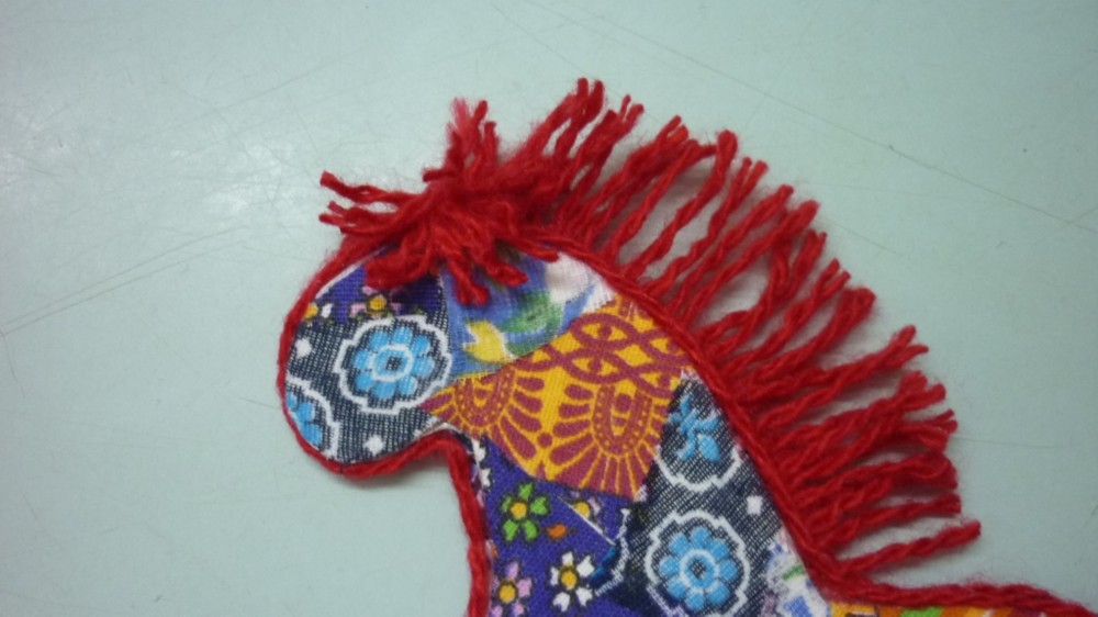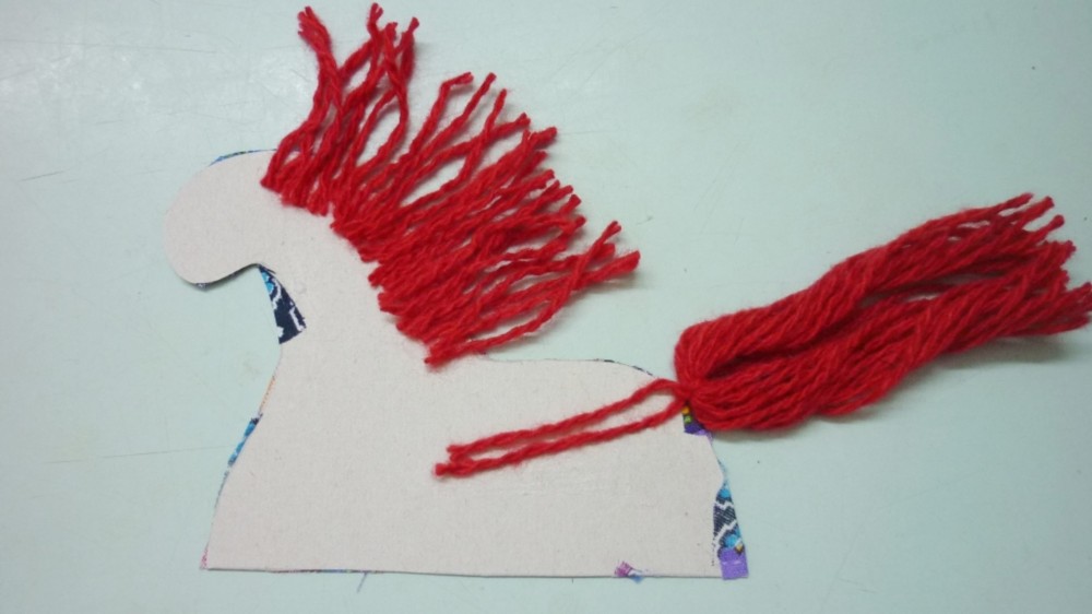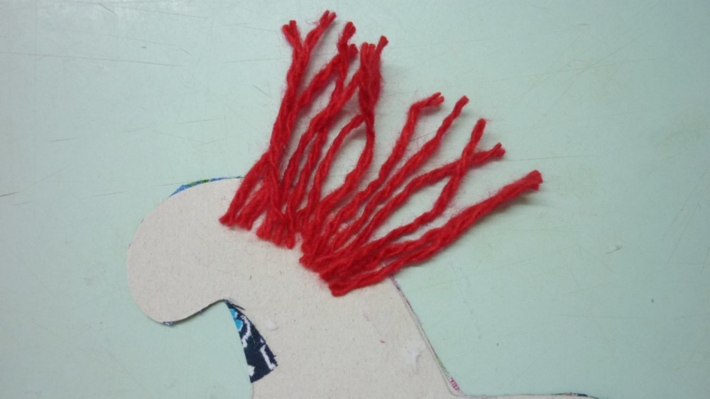 По всему внешнему срезу на клей «Контакт» наклеить шерстяную нить, начиная от челки вдоль гривы и закончив с другой стороны гривы. |