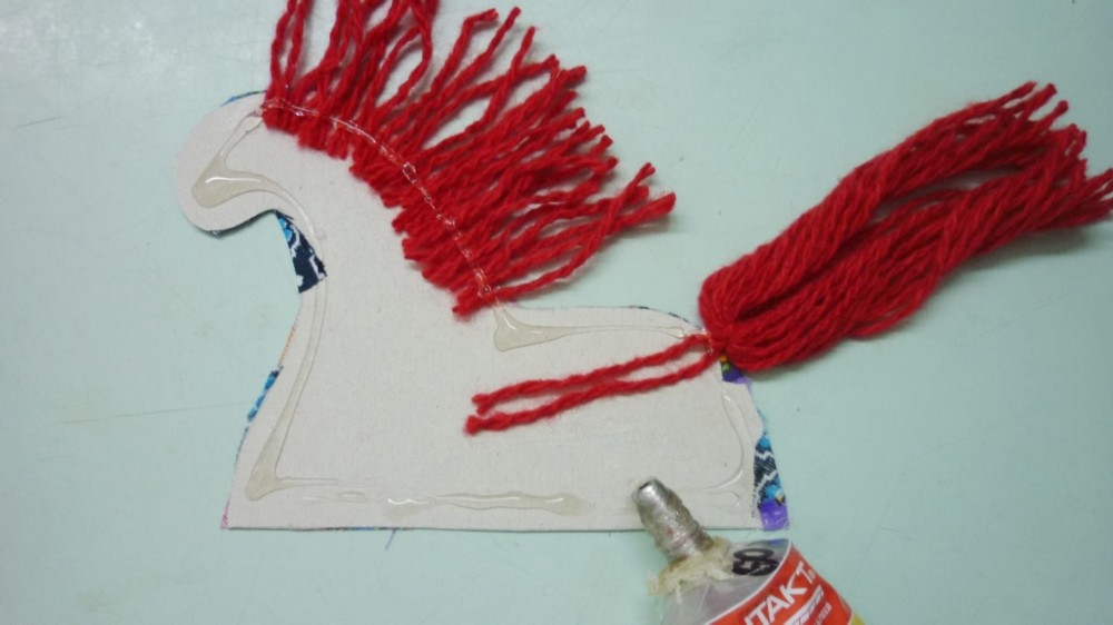 Смазать клеем-карандашом внутреннюю часть заготовки от верхней части головы до спинки, приклеить нитки - гриву |