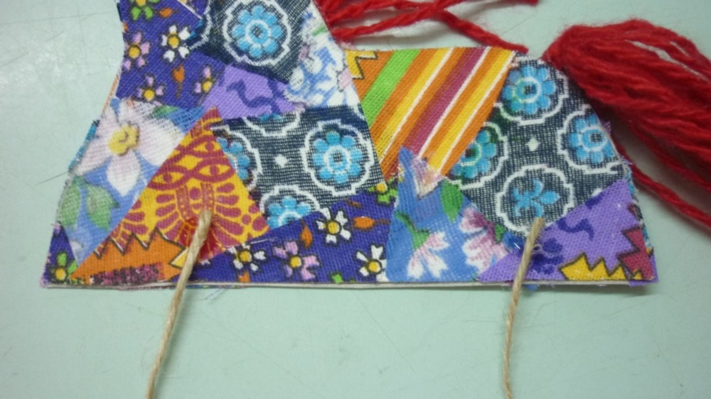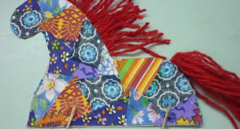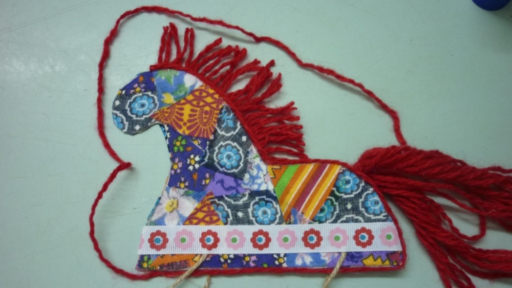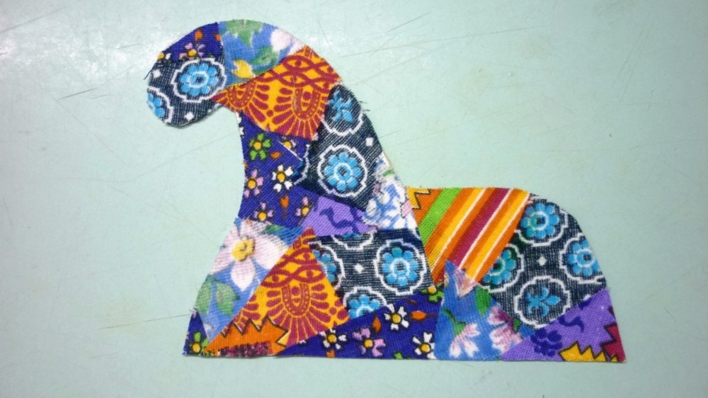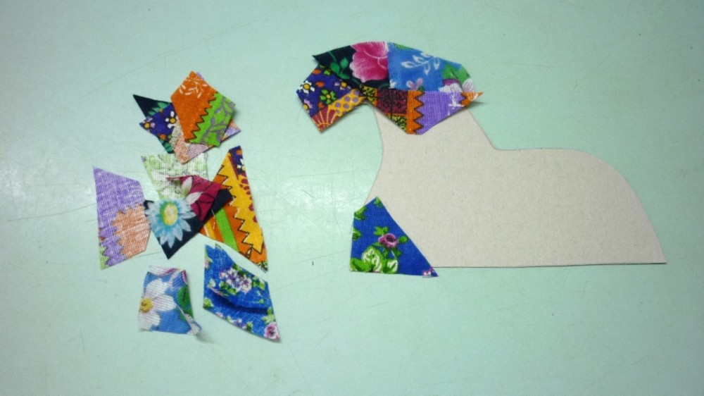 Намазать верхнюю часть головы заготовки лошадки клеем-карандашом и наклеить кусочки ткани, чередуя разные ткани. |