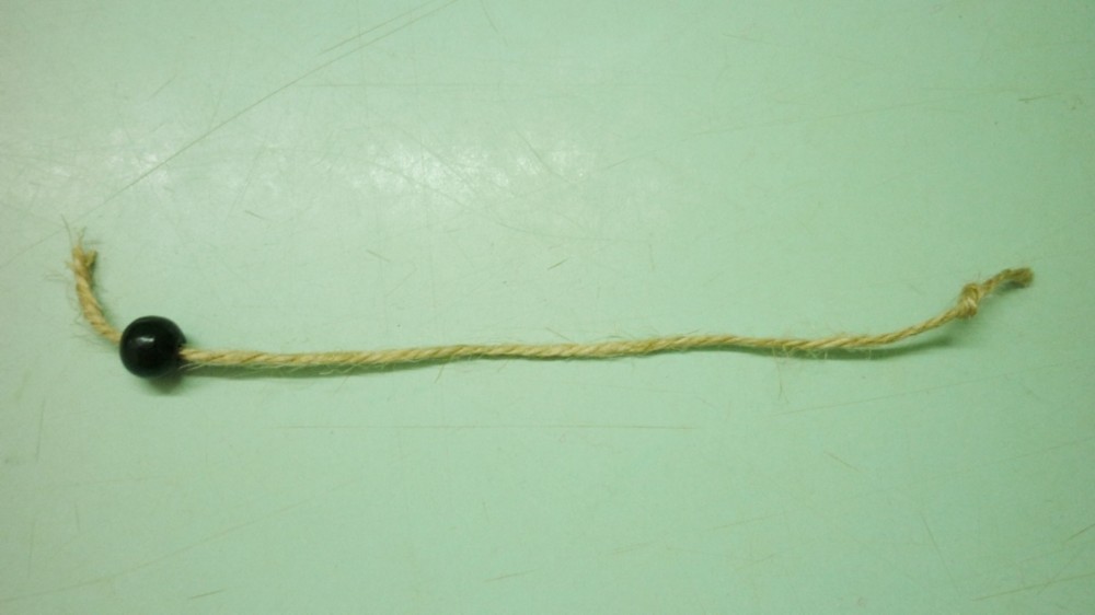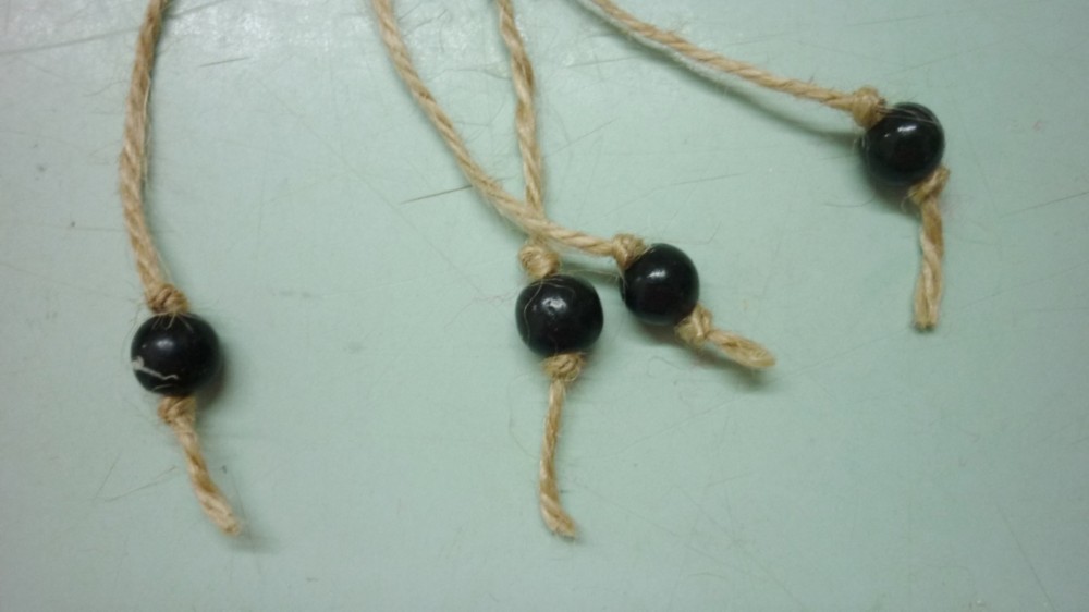 Сутаж разрезать на 4 части (по 10 см). На одном конце ниточек завязать узелки и надеть бусинки. |