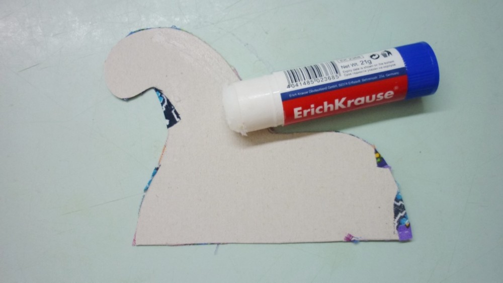 Ткань, выходящую за края заготовки срезать, или подклеить клеем-карандашом на изнаночную сторону. |