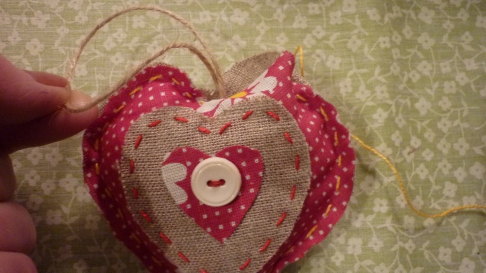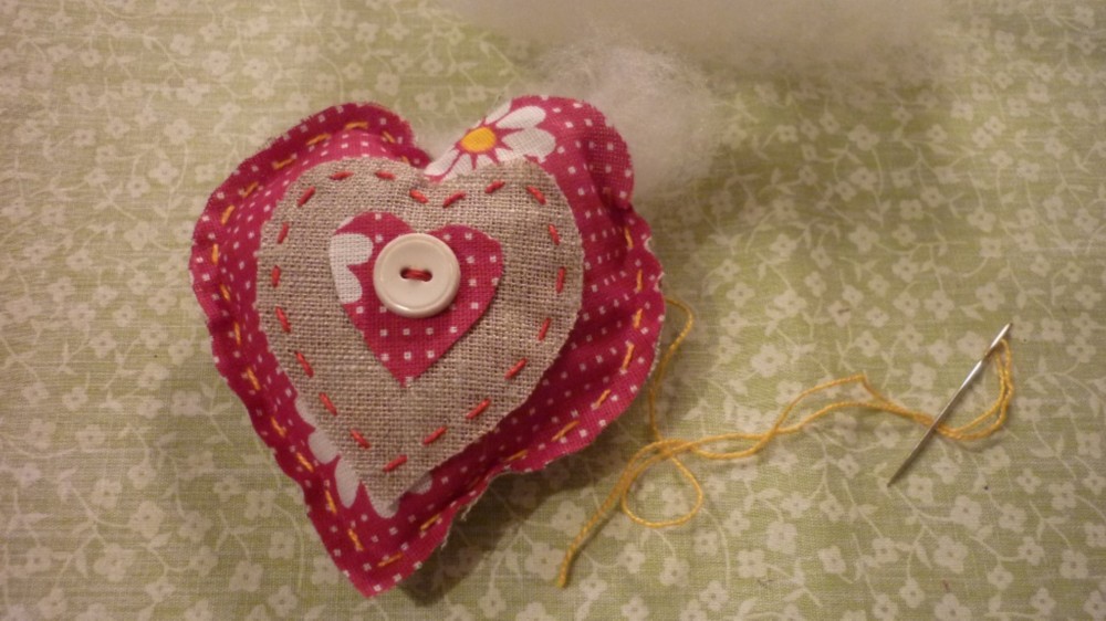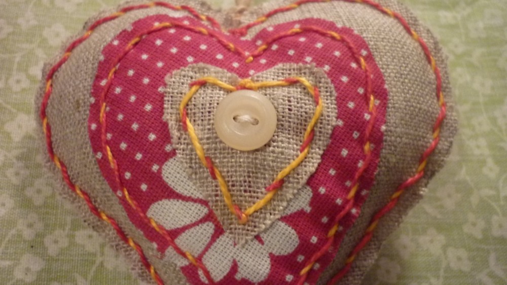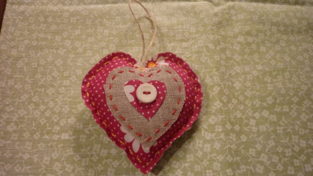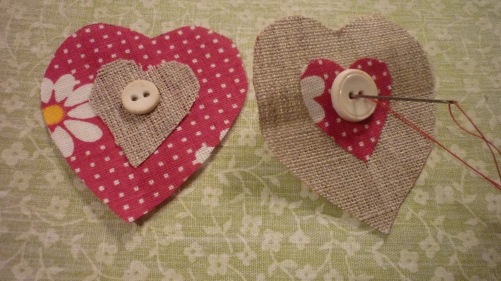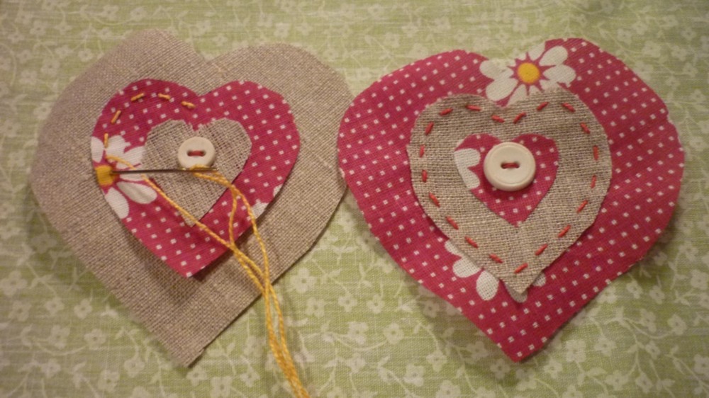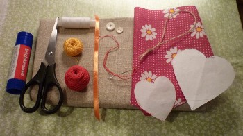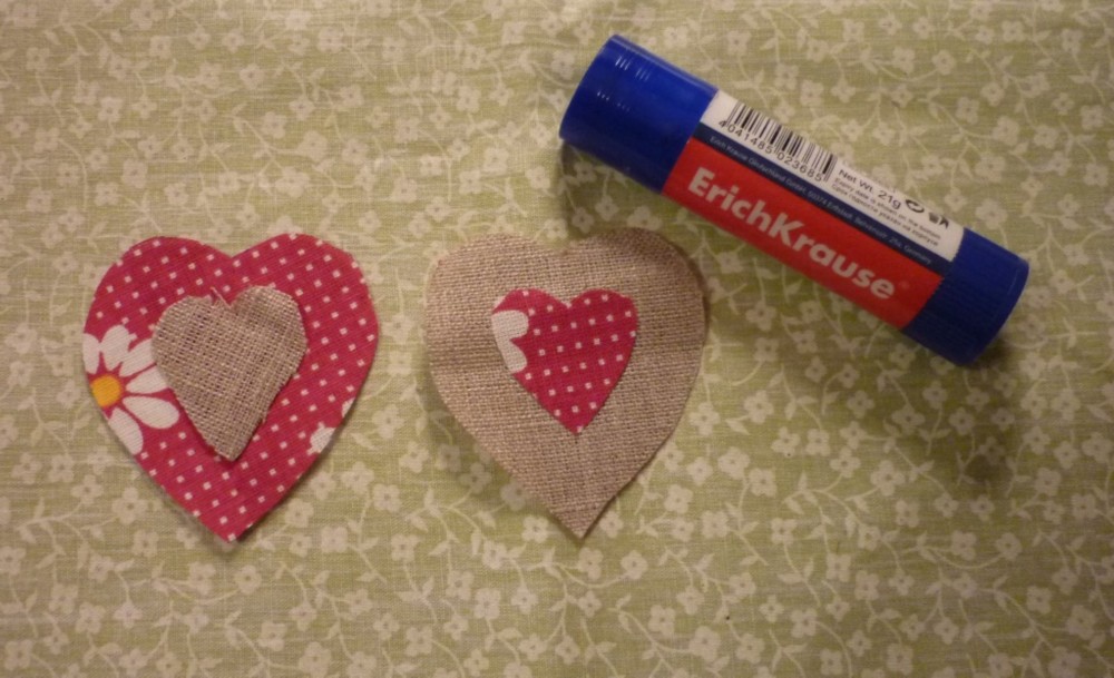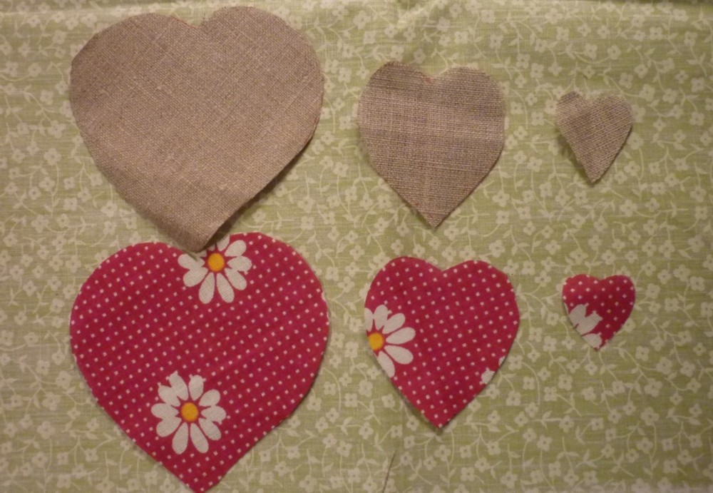 С помощью шаблона вырезать из бортовки большое, среднее и маленькое сердечки. Точно такие же сердечки вырезать из разноцветного ситца.